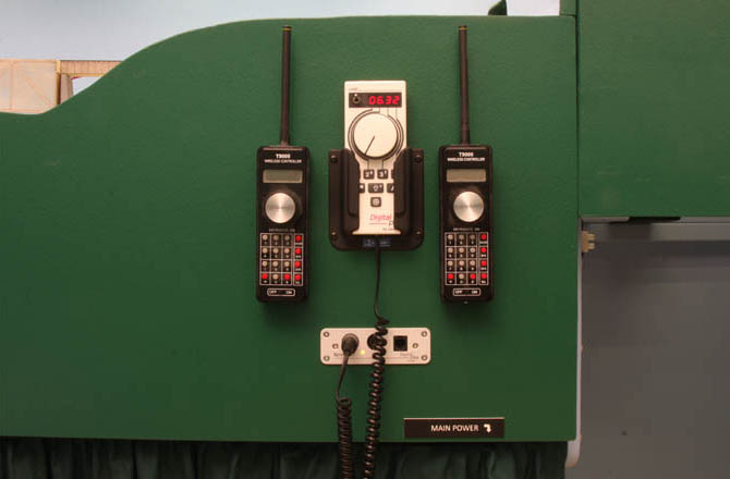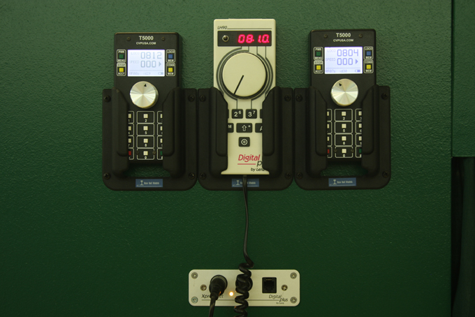 The previous photograph shows the fascia plate and throttle pockets at the north end of the yard; this photograph shows a similar installation at the south end of the yard. The fascia plates provide inputs for the throttles and a status light for the command bus.
