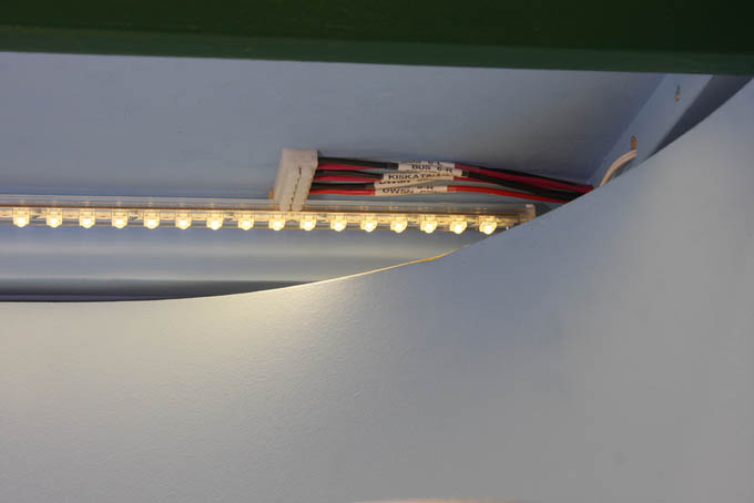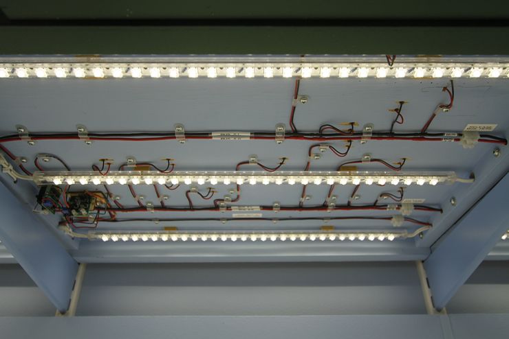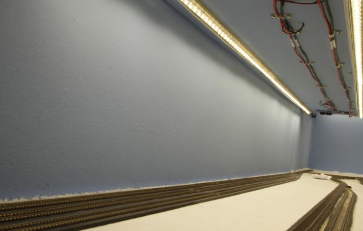 The track bus was divided into two runs underneath the yard to spread out the connection of feeder wires. The 14 AWG track bus wires can be seen, as well as the smaller 18 AWG auxiliary power bus further in. Note that the LED light strips were mounted on small blocks to allow for the passage of wiring above.