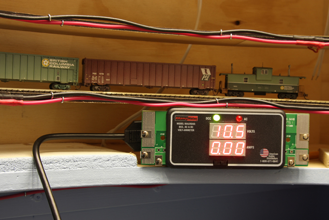 The first Ramp Meter was prepared for permanent installation with bus wires attached to either end. This was installed immediately after the command station and ahead of the circuit breakers, and mounted out on the fascia where it could be seen from anywhere in the layout room.