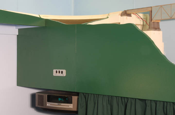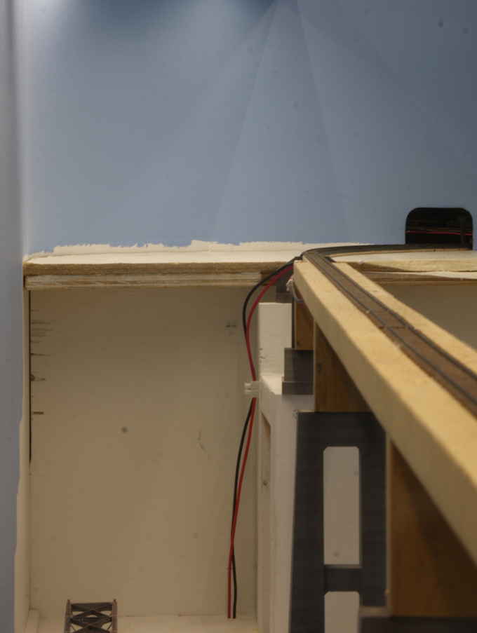 This section of benchwork includes the Kiskatinaw River bridge, for which hte feeder wires were routed down to terminal blocks for easy removal, and then down to the bus wires.