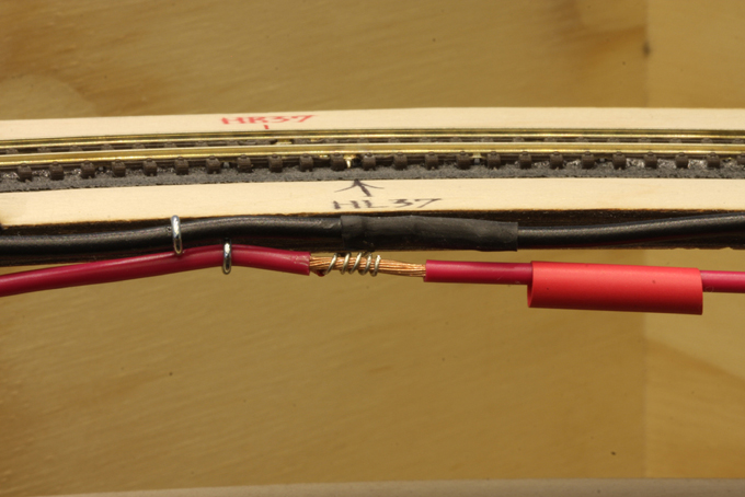 Note the short length of heat shrink tubing ready to be moved into place over the solder joint. I pre-position these on the bus wires as I go along, and then move them into place after the solder joint has cooled. In this photograph you can see the tubing on the black bus wire already in place.