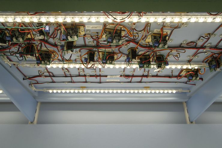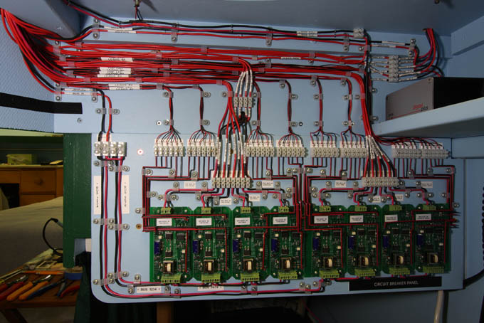 This photograph shows the circuit breaker panel after connecting all of the bus wires up to the reset switches, and the LED indicators up to the Power Management Panel.