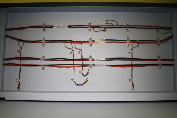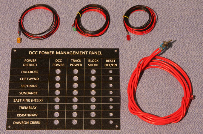 This photograph shows examples of lead wires soldered to the indicator LEDs and reset switches, and the lamicoid Power Management Panel which would house the LEDs and switches for each of the eight power districts around the layout.