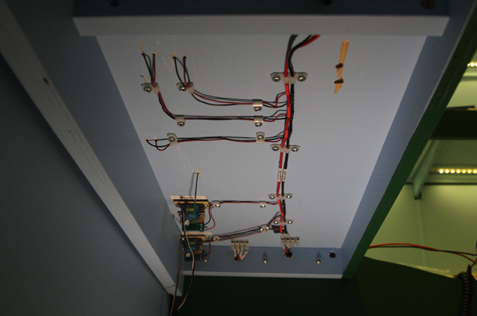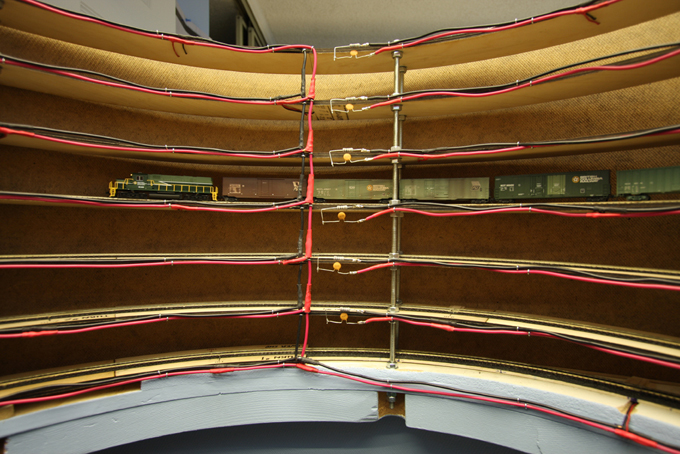 The bus wires for the lower deck are routed to the underside of the lower deck through a hole just above the circuit breaker panel, and those for the upper deck are routed through a hole above the command station and up inside the helix.