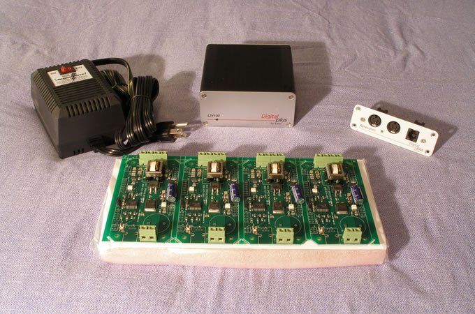 After operating on numerous layouts for more than twenty-five years, I selected Digital Command Control for my layout to facilitate more prototypical operation. I purchased the Lenz Set 100 with additional LH 90 throttles, and added CVP Products T9000E wireless throttles and RX900AL receiver for walkaround control. Pictured at left: DCC Specialties Magna Force MF615 Power Supply, Lenx LVZ100 Command Station, Lenz LA152 Xpress Net Adapter Plates for fascia, DCC Specialties PSX4 Circuit Breaker Modules.