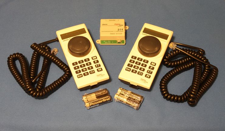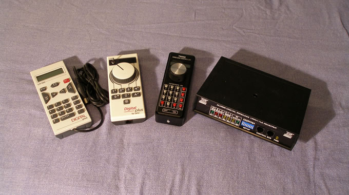From Left to Right: Lenz LH 100 Dispatcher's Throttle (for programming), Lenz LH 90 Engineer's Throttle (for operating), CVP Products T9000E wireless throttle for walkaround control, and CVP Products RX900AL receiver specifically for use with the Lenz DCC system. The wireless throttle and receiver are shown here without their antennas. All of these throttles have proven to be highly reliable and continue to perform well years later due to their high build quality.