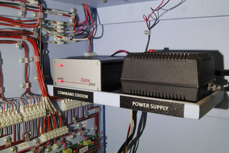A data cable is run from the command station to the LA152 fascia panels around the layout, into which the Lenz throttles may be plugged.