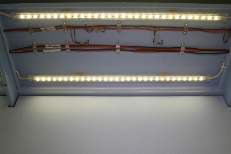 I changed out the name plate for MAIN POWER for a new one which incorporates a blue LED indicator light. This LED is powered from the supply for the fan which cools the command station, and is set to come on whenever the Main Power switch is thrown.