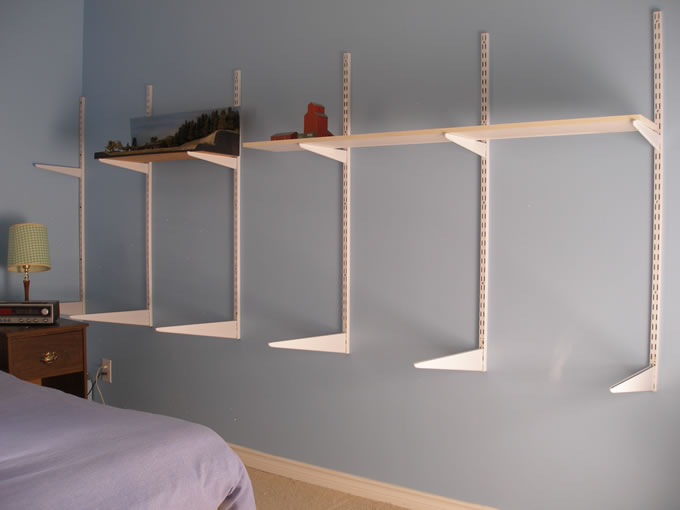 My friend Anthony Craig helped with their installation. We used a laser level to position the shelving standards as the floor in the room was not level.