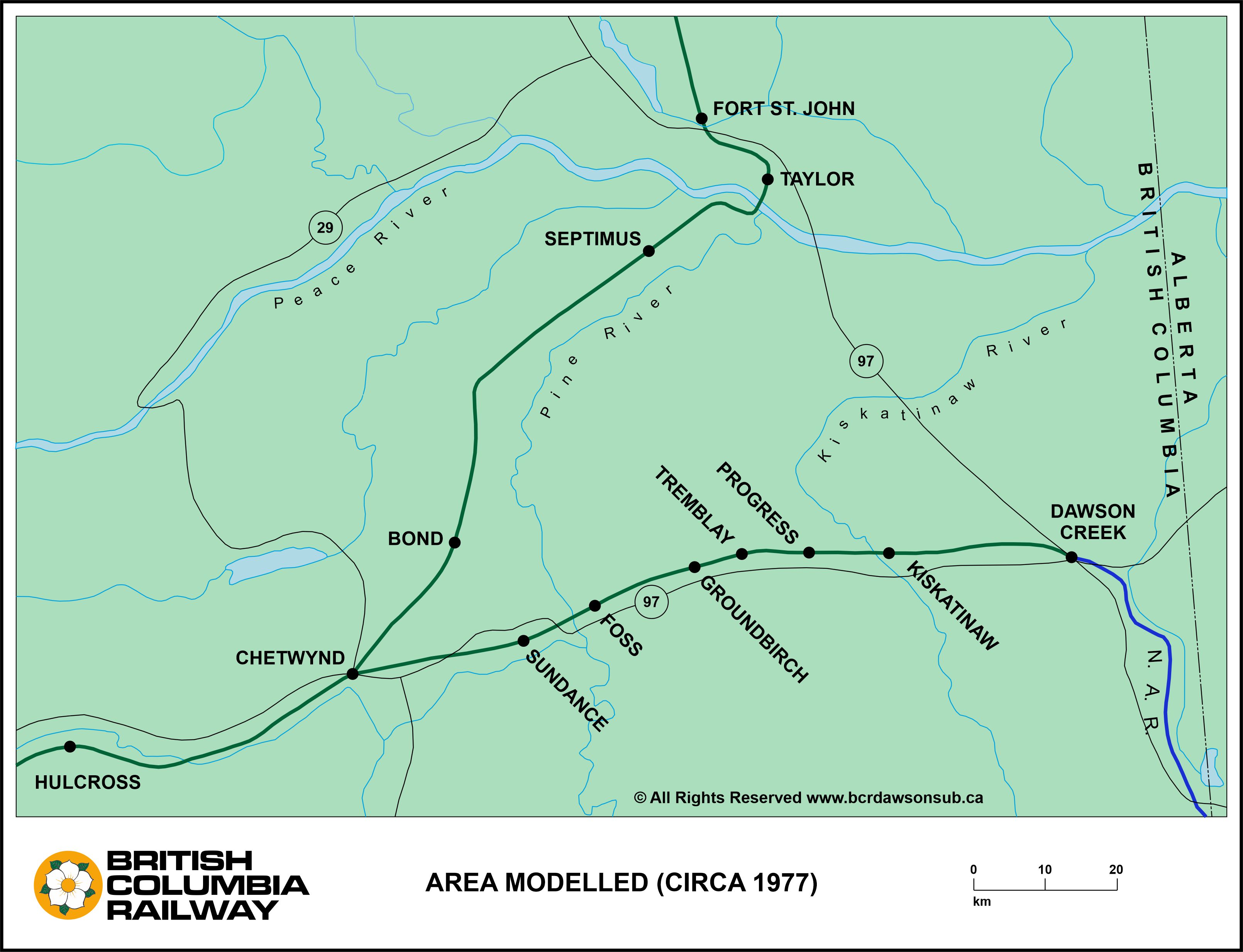 This detail map illustrates the area actually modelled on the layout, including the Dawson Creek Subdivision and a portion of the Fort St. John Subdivision as far north as Septimus.