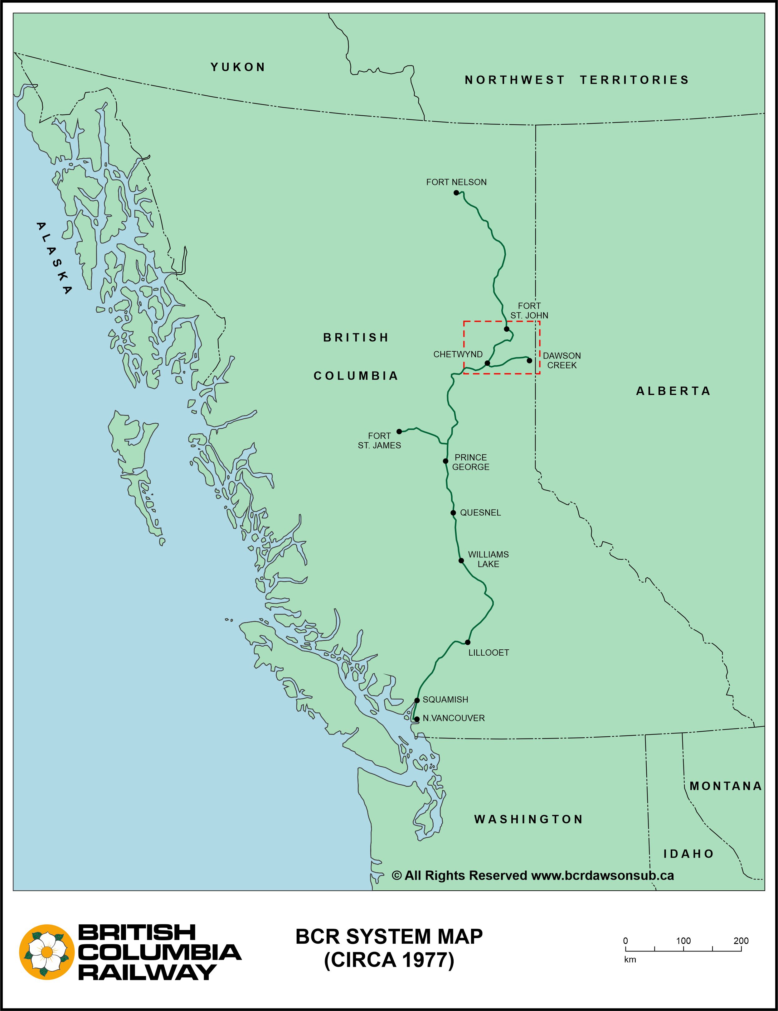 This overview map illustrates the British Columbia Railway system as it appeared in 1977, extending north from North Vancouver to Prince George, Fort St. James, Dawson Creek, Fort St. John and Fort Nelson.