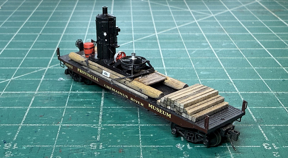 I have finally got around to securing the forestry exhibits on my two Provincial Museum flatcars. The Donkey engine was secured with brass wire representing steel cables, and the Climax locomotive was mounted on a piece of panel tack and cabled to the deck.