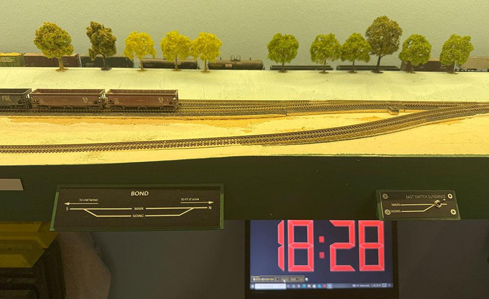 I have completed tracklaying and wiring at Septimus, and the first test trains are now plying back and forth through the new trackwork under temporary DC power. These sections represent a significant addition to the layout with a longer run to Septimus and extended siding capacity for longer trains. For more information on this recent work I invite you to check out my most recent layout update on my YouTube channel, which has now reached 200 subscribers! I have also recently uploaded a video on PGE Freight Car Paint & Stencil Schemes, and a companion video on BCR Schemes is in preparation.